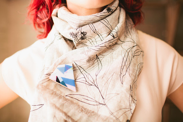 Flowering Gum in Black and Greylead Scarf secured with Emily Green brooch